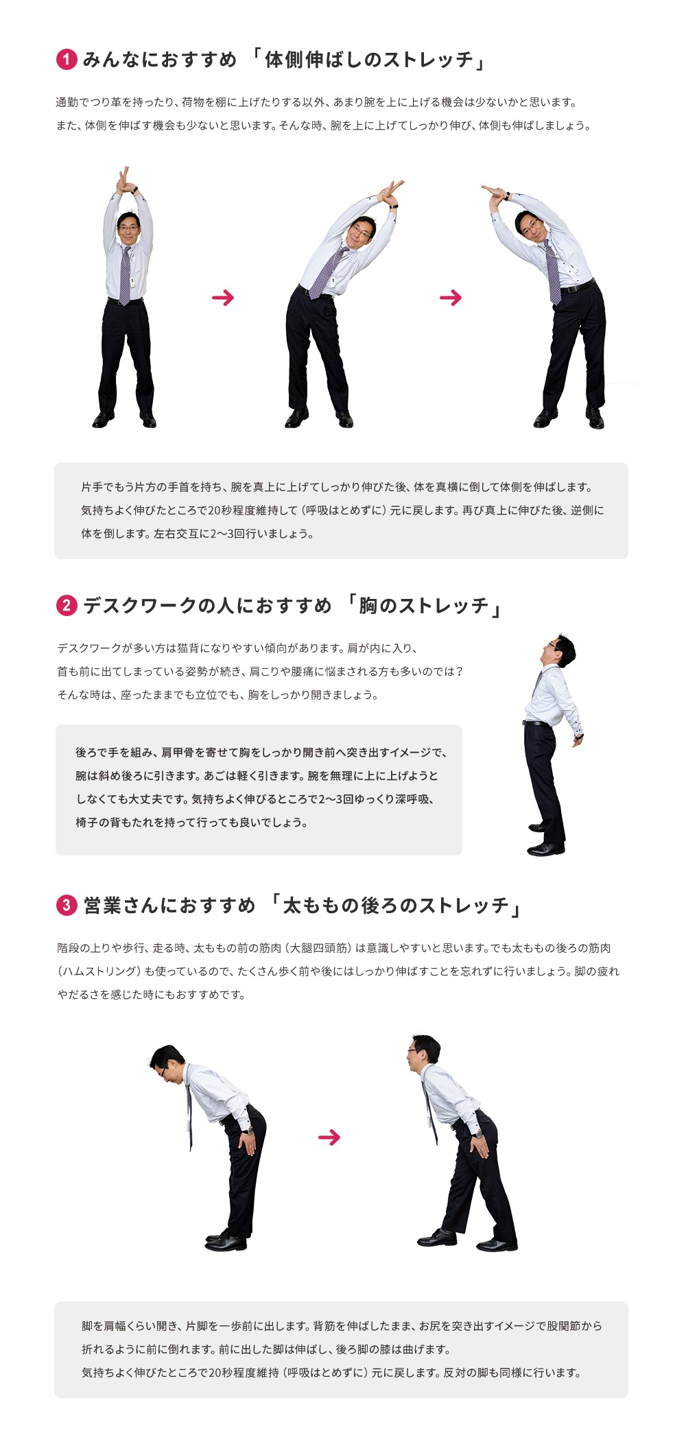 わかりました。道具を使わずにどこでもできるストレッチをご紹介しましょう。デスクワークの方向け、外出の多い営業さん向けなど3つあります。実際に行うと見た目より「効いている」感じがありますよ。