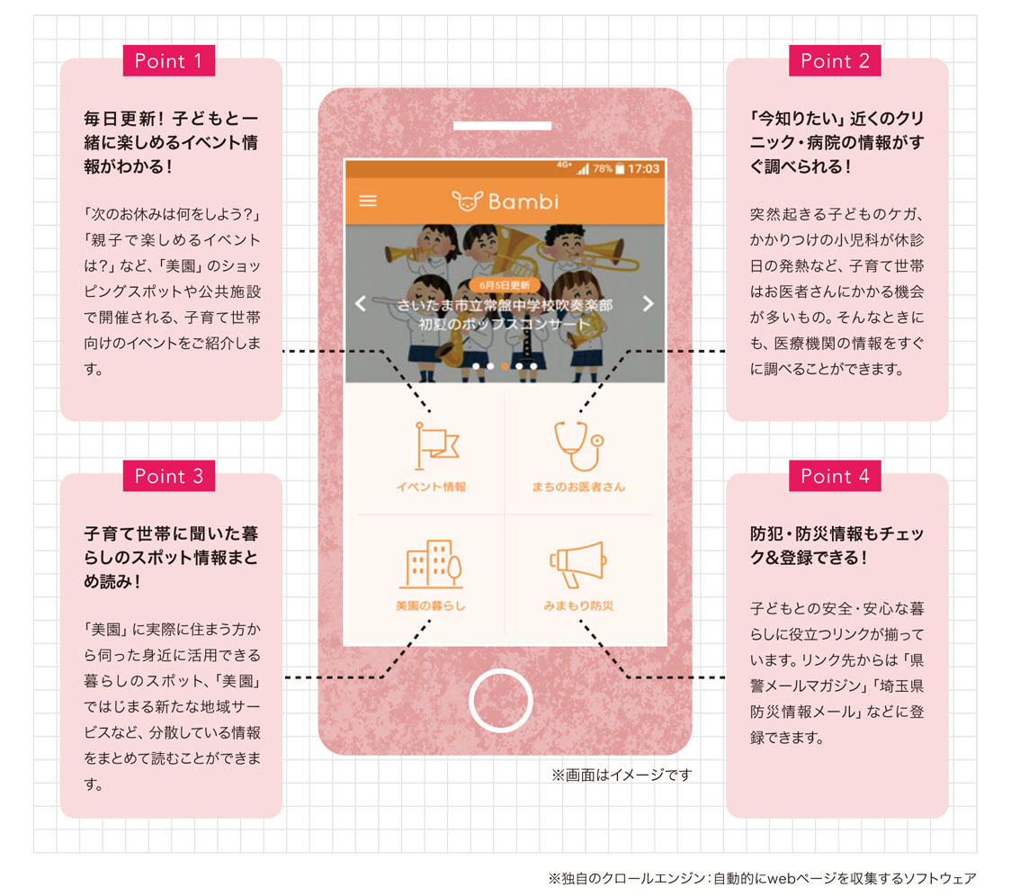 「Bambi」なら、最新の子育てイベント情報が毎日お手元に届き、行政の子育て支援情報ページにもサクサクアクセス可能! 子育て中のお父さん・お母さんの「困った!」「知りたい!」に応えます。