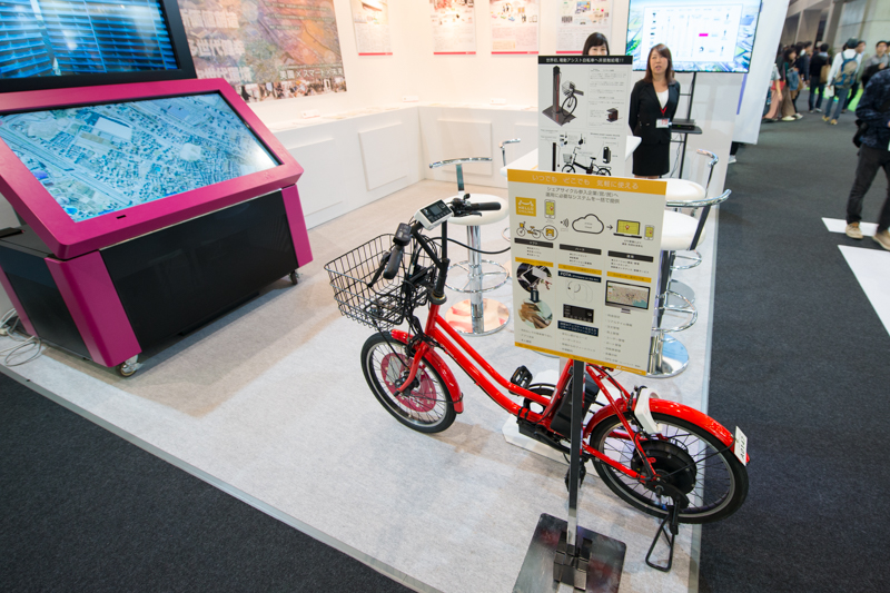 紹介された取り組みは、主に4つ。世界初となる電車の回生電力を超急速充電する電動バスの実用をめざした実証事業「ゼロエミッション地域公共交通インフラ」、また、天候・人数など状況に応じて最適な交通モードの選択を支援する「エコモビ(eco mobility sharing)」は実際の自転車も展示されました。ほかにも、Bluetoothによる位置情報を活用して車車間通信による事故防止やお年寄りや子どもの見守りサービスを展開し生活の安心・安全を向上させる取り組みや、地域情報を発信し生活を支援するサービスの提供システム「共通プラットフォームさいたま版」など、美園のまちづくりに関する様々な取り組みがVRや映像、パネル等で展示されました。