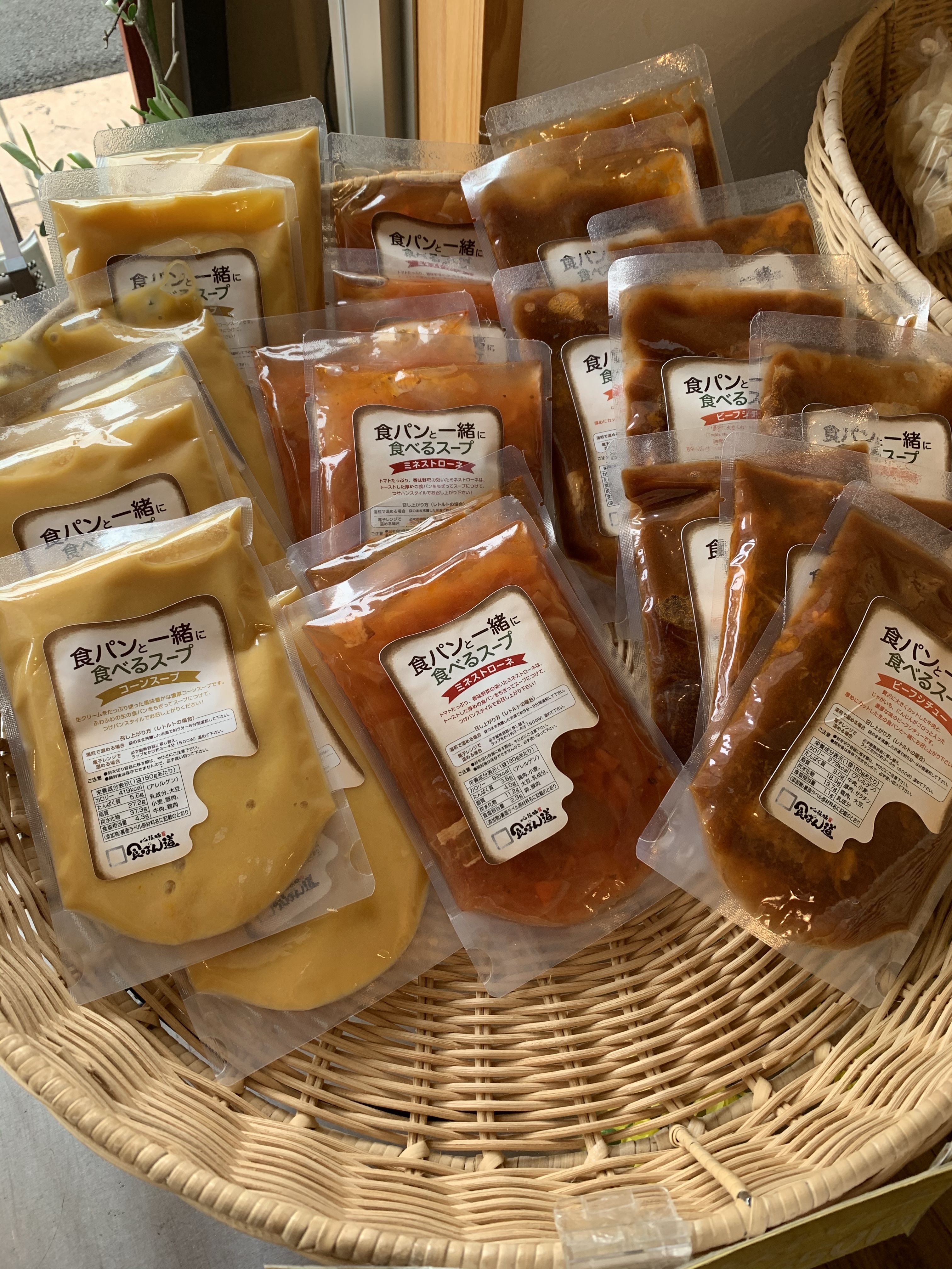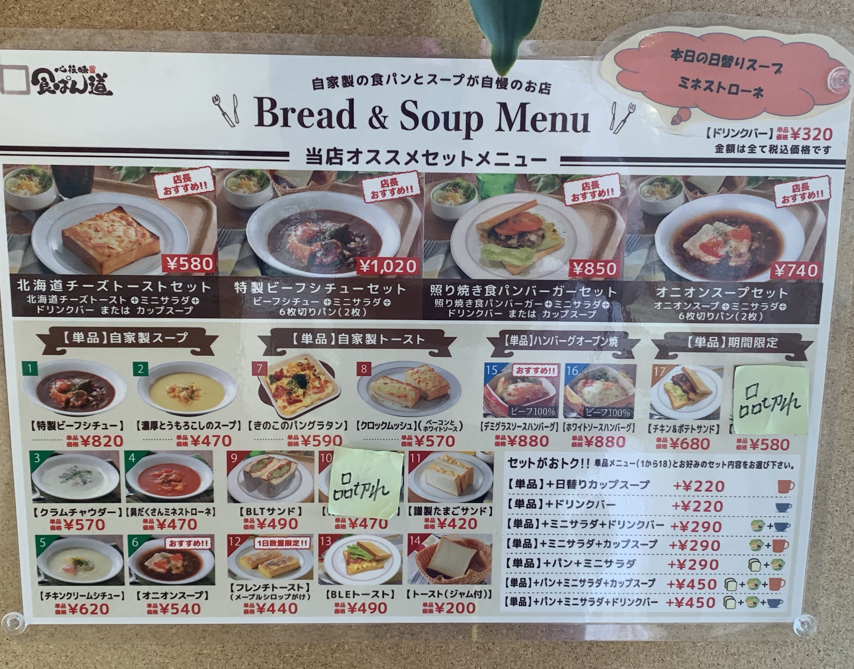 コーンスープ、ミネストローネ、ビーフシチューがあります