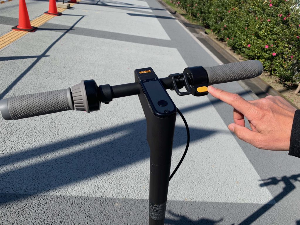 右のこのボタンがアクセルでこちらを押しながら、左のハンドルがブレーキ。自転車感覚で乗れます。