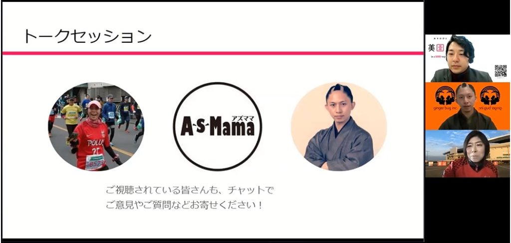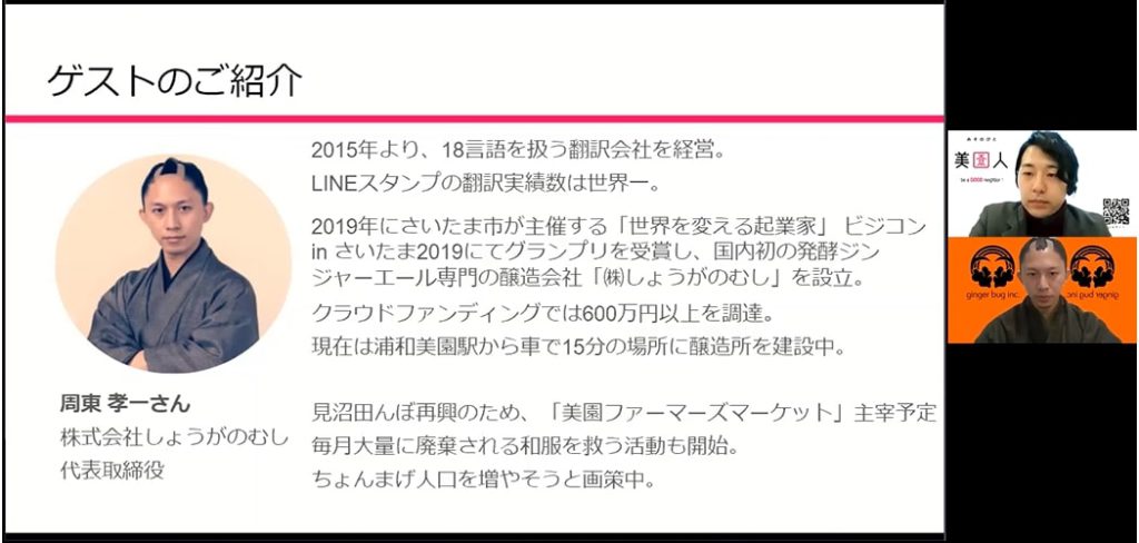 そして最後は、株式会社しょうがのむし 代表の周東 孝一さんの登場。和服にちょんまげの姿は、オンライン上でもインパクト抜群ですね。