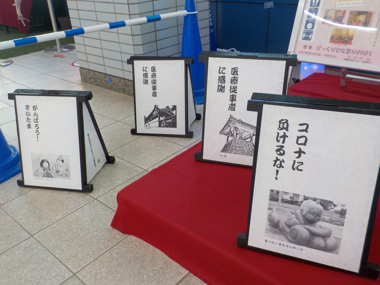 コロナに負けるな!のメッセージの行燈風のオブジェも。