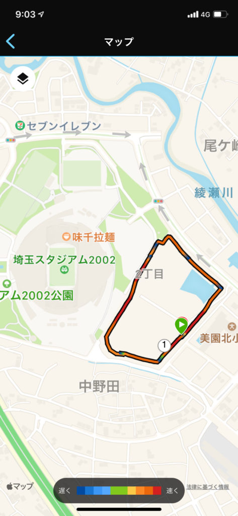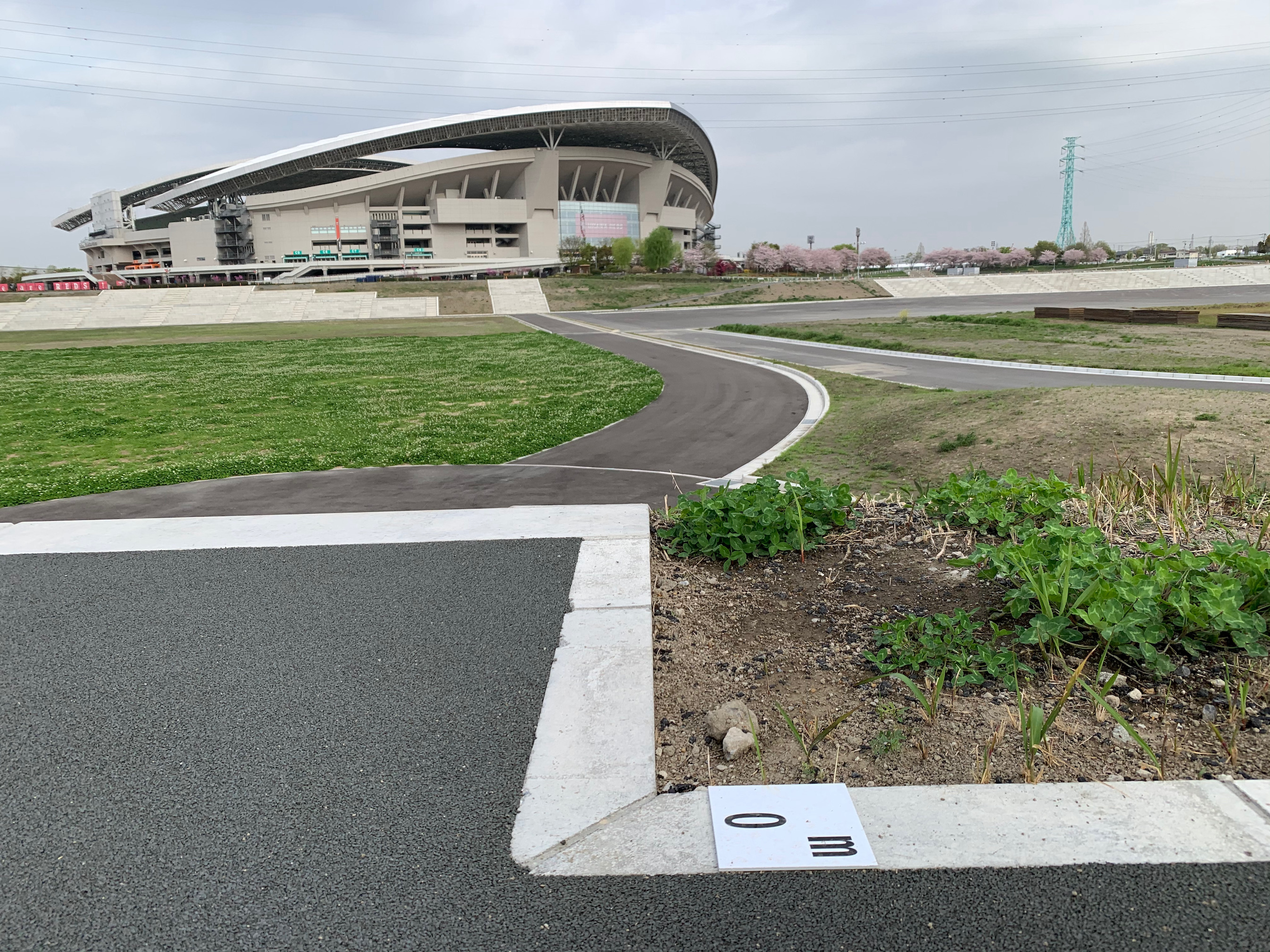 私個人は、ここ1周は1km弱なので、スタジアム周辺を1周(約2km)するのがしんどい時にこっちを走ったりしています。スタジアム周辺はアップダウンもあるのですが、こちらはフラットなのでスピードも出やすいです(ただし、カーブもありますし、お散歩している方もいるので走る時は周囲の状況に注意する必要があります)。