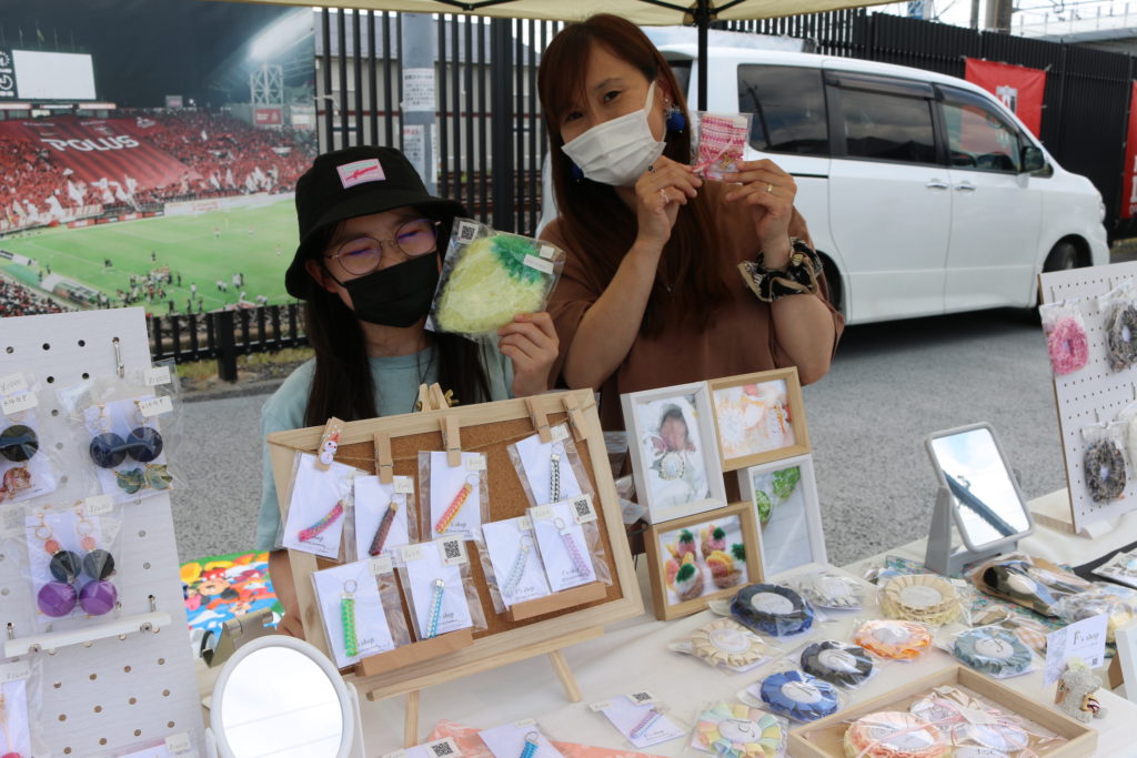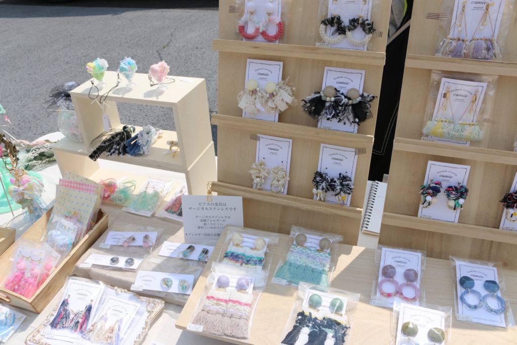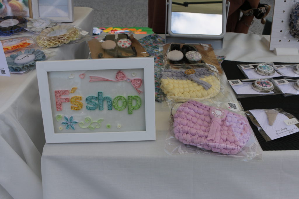 リボンやカラフルな糸を使ってのかぎ針小物がとっても可愛い。ロゼットというメダルにアルファベットやお名前を描く、出産祝いのマンスリーロゼットや、ベビーカー用のS字フックなどが可愛かったです。中でもこの日人気だったのはアクリルたわし!水キレが良くて泡切れがいいとか。この写真のお嬢さん(左)が持っていらっしゃるイチゴ型のものです。本業は保育士さんということで、この日は初出店だったそう。インスタ配信などもされているようですので、気になった方はぜひチェックをしてみてください。