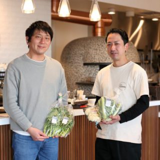 ヨーロッパ野菜を生産する地元農家の森田さん(左)と「カフェジャルディーノ」シェフ門平さん(右)