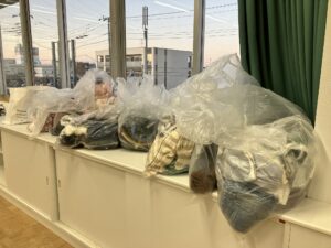 部員の皆さんを若干驚かせつつ(ごめんなさい)、顧問の榎本和正先生のご案内のもと、着々と集まってきた服の山を見せていただき、お話を伺いました。