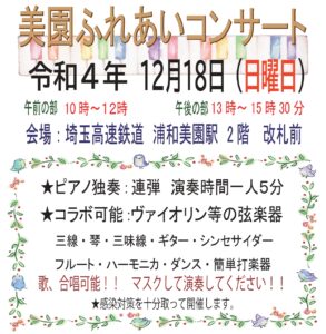 【浦和8番目の駅】12/18ストリートピアノ囲み復活開催♪「美園ふれあいコンサート」
