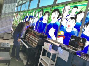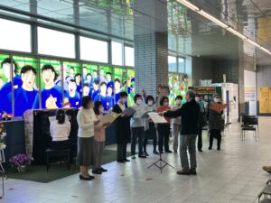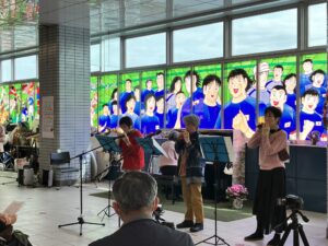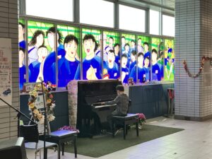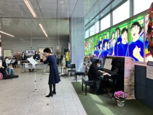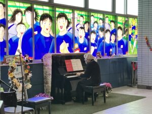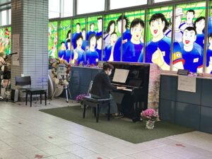 サッカーのまちを象徴するようなブルーのユニフォームが印象的な「キャプテン翼」のステンドグラスから春の日差しが差し込む中、去る3月12日、埼玉高速鉄道「浦和美園」駅に設置されたストリートピアノ「美園ふれあいピアノ」を囲み、「美園ふれあいコンサート春」が開催されました。