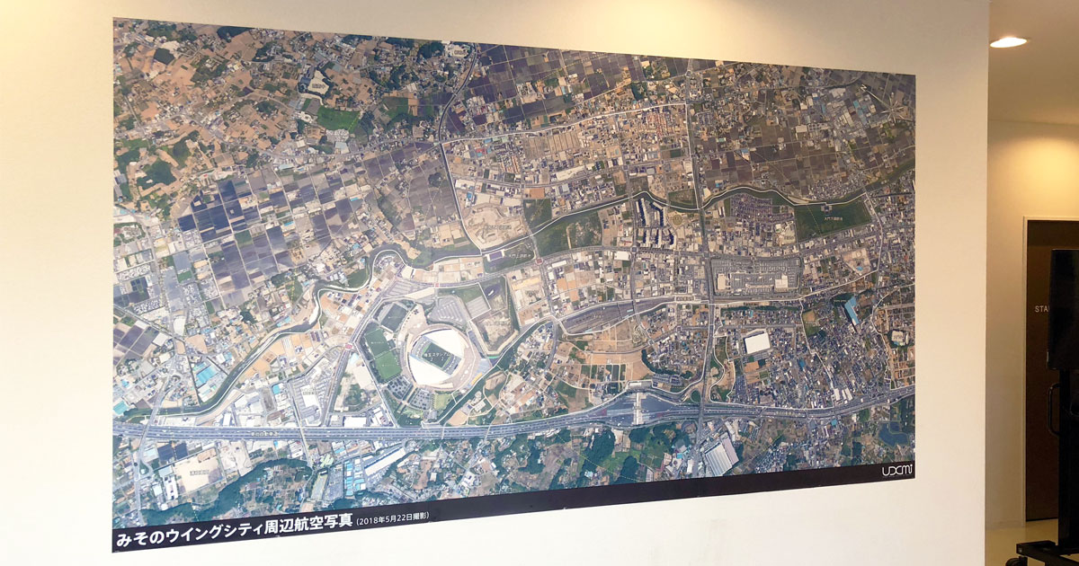 その中でも、最も大きな面積を占める“目玉”展示物として、みそのウイングシティ開発区域周辺の航空写真を掲示しております。